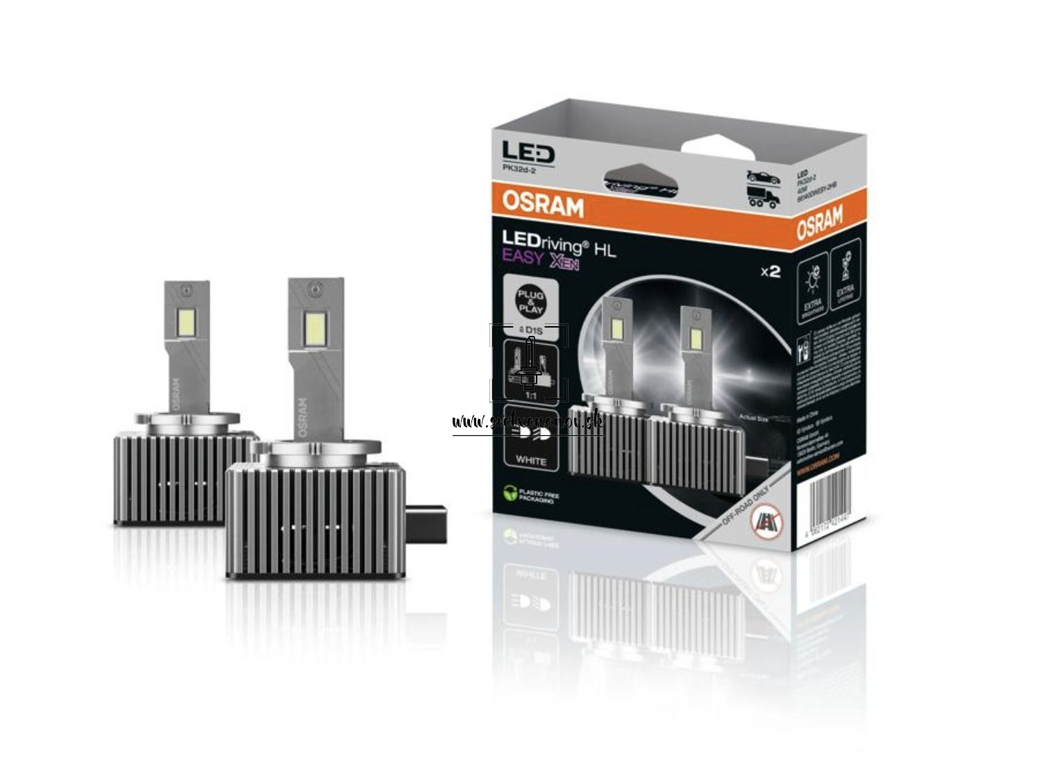 Prvý Plug & Play off-road LED od spoločnosti OSRAM – náhrada za xenónové výbojky s až o +180% vyšším jasom zaisťuje OSRAM LEDriving HL EASY XEN kompaktnú LED náhradu výbojok do diaľkových a stretávacích svetiel D1S. Tieto LED výbojky sú kompatibilné s 12V/ 24V, dodávajú sa s farebnou teplotou 6 500 K a zaisťujú širšiu distribúciu svetla: viac svetla umožňuje lepšie videnie a tým aj rýchlejšiu reakciu. Špičková technológia OSRAM s integrovaným aktívnym chladením – vysokorýchlostným ventilátorom – poskytuje maximálny odvod tepla pre maximálny výkon. Vynikajúca kvalita OSRAM a technológie LED zaisťujú dlhú životnosť.