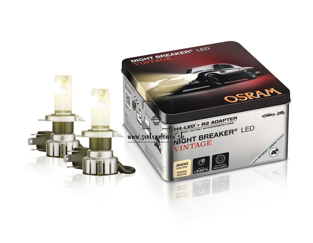 Moderné technológie pre nadčasovú klasiku. Ikonický vývoj v oblasti náhradných žiaroviek - teraz tiež pre klasické a historické automobily a príznivce tradičných teplých bielych farieb svetla. S legálnymi LED žiarovkami NIGHT BREAKER LED VINTAGE H4 prináša OSRAM špičkovú LED technológiu do sveta historických áut, kombinuje moderný výkon a technológie s nadčasovým štýlom. Nielen, že osvetľuje cestu pred vami, ale ladí s vaším vozidlom. So svojou teplou bielou farbou svetla až 3000 Kelvinou táto legálna LED žiarovka vytvára charakteristickú farbu svetla žiarovky a nostalgický lesk, ktorý veľmi odráža charakter klasických automobilov, ale tiež ohromuje až o 330 % väčší jas, pričom oslnenie pre ostatnú cestnú premávku je až o 50 % nižší ako maximálne povolené hodnoty. Bezproblémovo sa integruje do celkového vzhľadu a estetiky historických vozidiel, spája autenticitu s bezpečnosťou, viditeľnosťou a jasnosťou. Je určený aj pre šoférov moderných áut, ktorí uprednostňujú teplejšiu farbu svetla. Vybavený ďalším adaptérom R2 je LED žiarovka NIGHT BREAKER LED VINTAGE H4 vhodná nielen pre náhradu H4 halogénové autožiarovky, ale môže byť nainštalovaná aj miesto R2. Integrovaná technológia „Constant-Brightness“ zabezpečuje, že spoľahlivý výkon i pri kolísajúcom a nízkom napätí batérie – pre pôsobivý výkon a stabilný jas a bezstarostný pocit pri každej jazde. Vďaka prémiovej kvalite OSRAM je LED žiarovka nielen robustná a odolná proti vibráciám, efektívna a trvanlivá, ale tiež prekvapí životnosť, ktorá je až šesťkrát dlhšia než u bežných halogénových autožárovkach. Navyše nevydáva žiadne UV žiarenie, a preto môže reflektor a čočka pôvodného svetlometu zostane nepoškodená. NIGHT BREAKER LED VINTAGE H4 je zdrojom svetla, ktorý rešpektuje pôvodný vzhľad vozidla a spája históriu s budúcnosťou. Okrem toho OSRAM ponúka špeciálnu záruku na všetky retrofity NIGHT BREAKER™ LED.